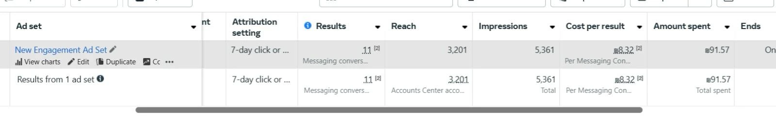 الصورة التالية هي لقطة شاشة من إعلانات فيسبوك (Ads Manager) وتوضح نتائج حملة إعلانية واحدة. وهذا ملخ العناصر الأساسية الموجودة: